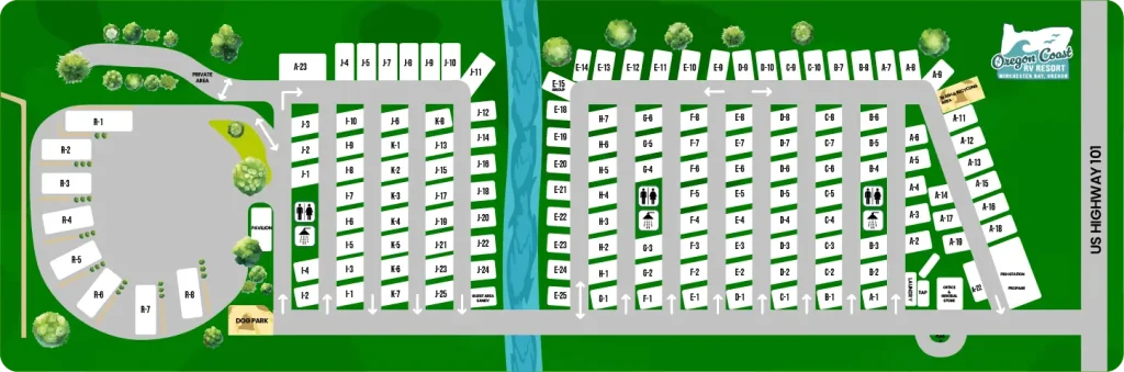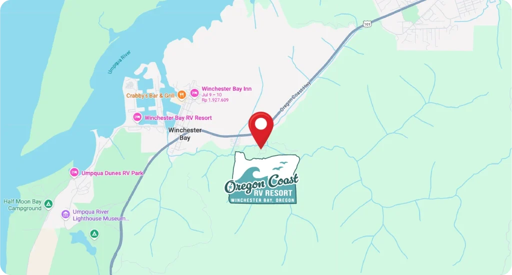 At Oregon Coast RV Resort, comfort and convenience come standard. Our RV park features three clean and spacious bathroom facilities with hot showers, a fully stocked office and camp store offering snacks, drinks, souvenirs, and local gifts, plus a peaceful creek that winds its way into scenic Winchester Bay.